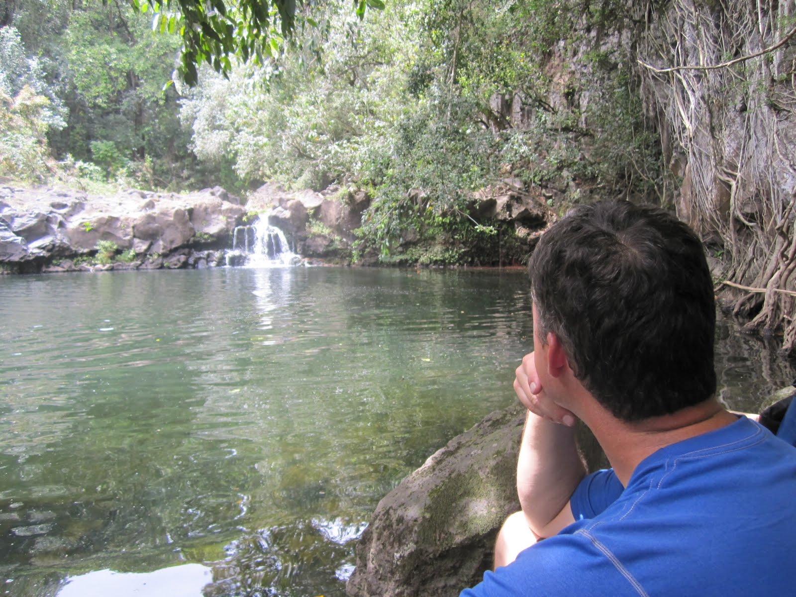 The hike was both a bit more taxing than I had imagined because I was wearing my Keen bicycle sandals. They were the perfect shoe for biking on the island of Maui. My tan lines, months later are still visible. However, they were not meant for hiking and exploring. They have a very stiff bottom so that there is plenty of support while pedaling. The downside to that when hiking is that there is no flexibility and my knees took the brunt of every step up or down on the paths and stairway leading to the falls. I had just completed my first marathon and my knees were still smarting with each step. I winced a little inside as we moved both toward and away from the falls. Even so, I am glad I went on the hike that day.