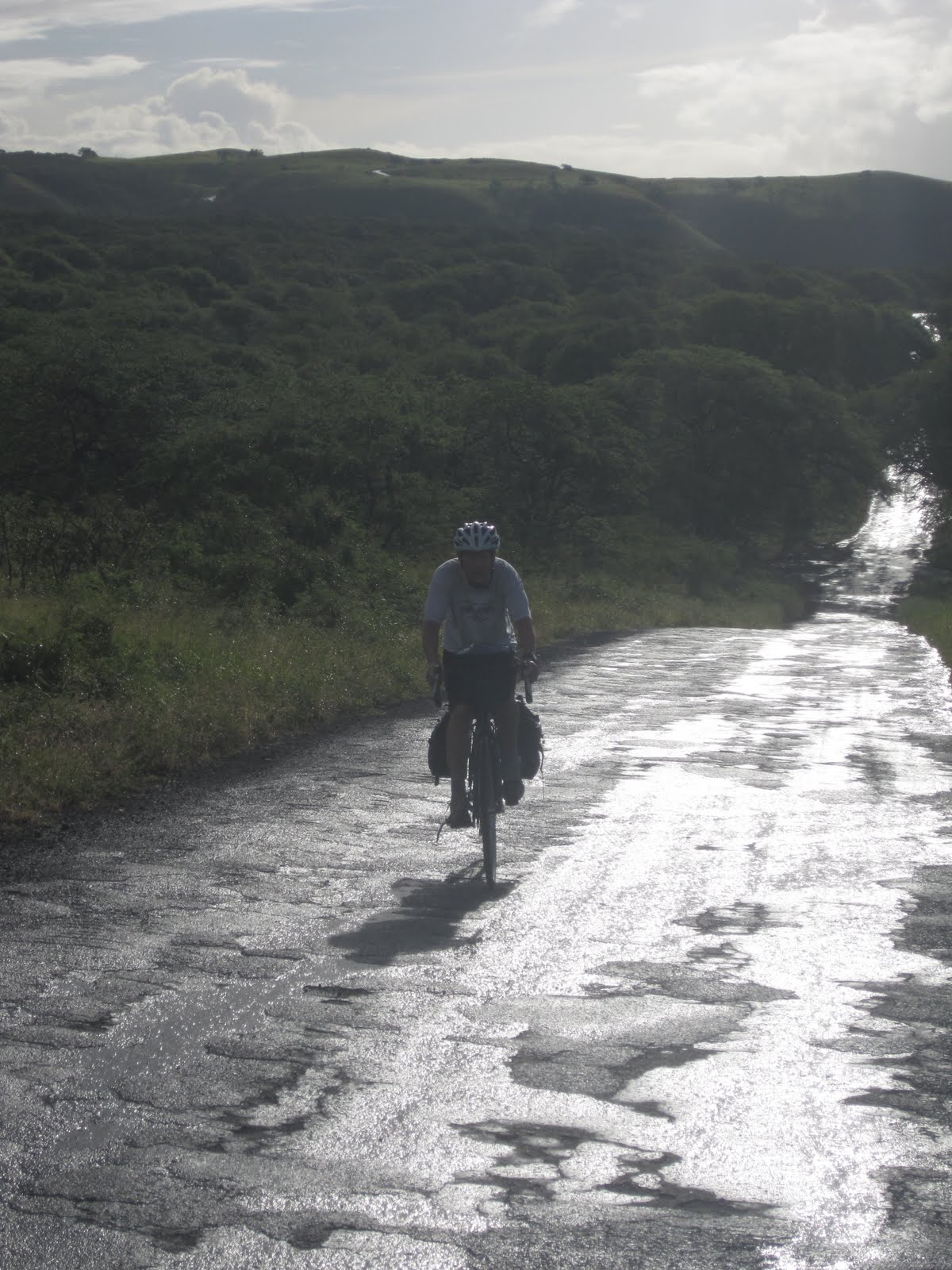 I was hungry and out of food, thirsty, and out of water. I had no light or lamps and I had run out of cash in my wallet so the mere fact that there were no stores along the road didn't seem to matter. My rear bike derailleur was not cooperating and my chain kept switching gears as I was going uphill. My pedaling had to be done while standing and my feet were slipping from the pedals, despite the cleats. I had more bruises than could be counted and eventually I knew my slow pace had separated me from my two companions. I was traveling alone. I ignored the catcalls of local teens driving by but was aware I might find it necessary to put up a fight, if need be. I pressed on.